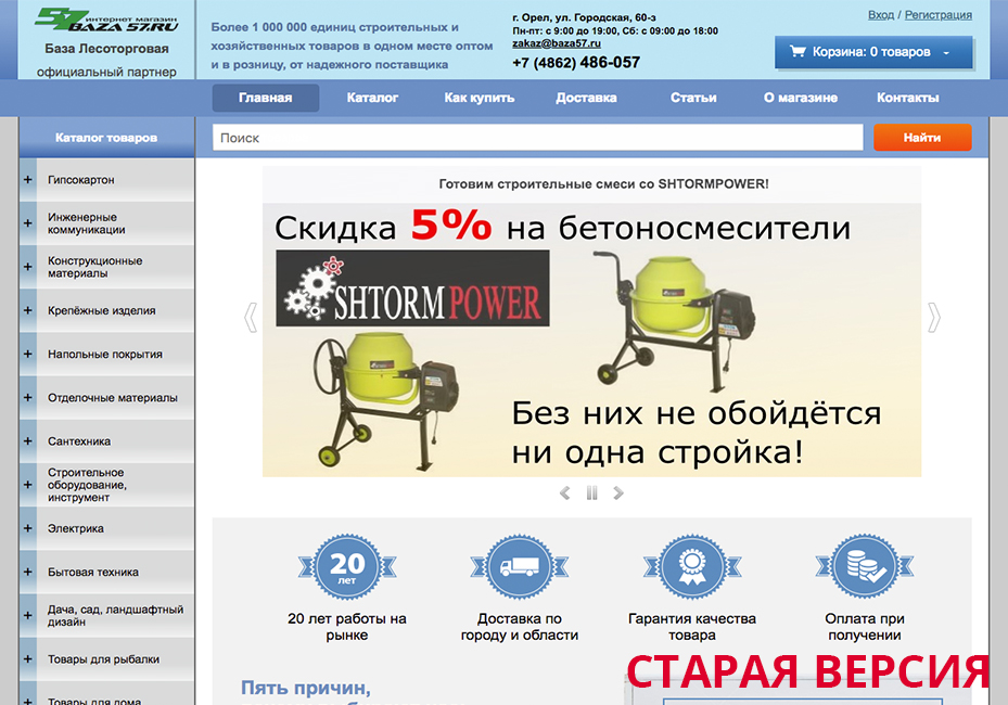 «База 57» — интернет-магазин строительных материалов, а также товаров для ремонта и строительства. Является официальным партнером базы «Лесоторговая» — крупнейшей в Орловской области. Сайт имел неплохую по региональным меркам посещаемость, но приносил мало заказов.