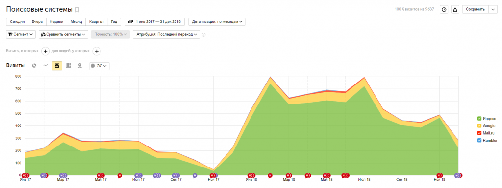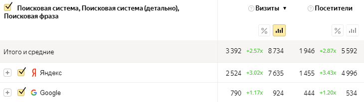 Таким образом, за год работы мы увеличили количество целевых посетителей из поисковых систем на сайт в 2,87 раза.